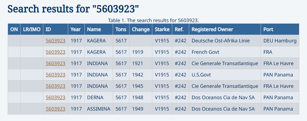 Voici la fiche Miramar du navire KAGERA, futur INDIANA de la Compagnie Générale Transatlantique :