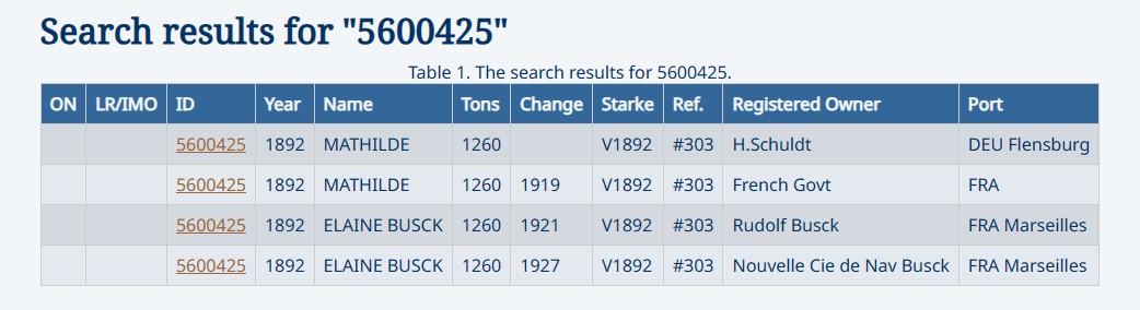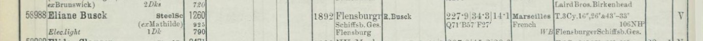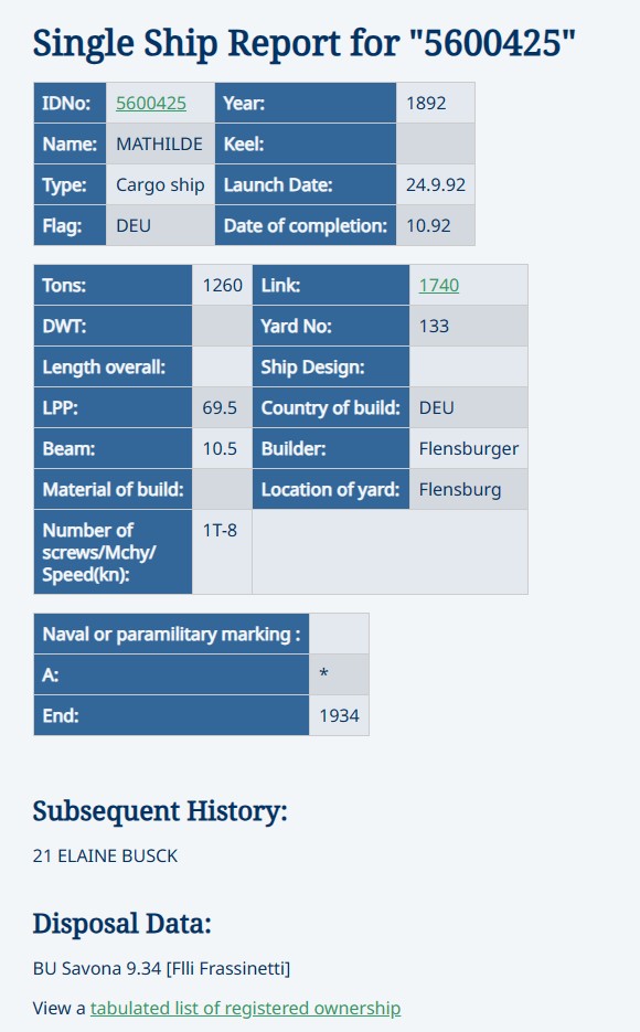 Voici la fiche Miramar du navire MATHILDE, futur ELAINE (ELIANE) BUSCK de la Compagnie Rudolf Busck :