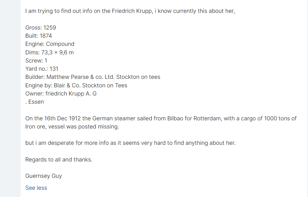 Cargo minéralier en fer lancé le 2 avril 1874 par la société de construction navale Matthew Pearse & Co., de Stockton-on-Tees (North Yorkshire, Royaume-Uni), pour le compte de la société métallurgique Friedrich Krupp Reederei, établie à Essen (Ruhr, Allemagne) ; № de chantier : 132. (1) Attaché au port de Kiel ; signal distinctif : L.C.D.V.