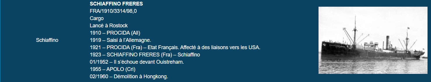 Voici la fiche Miramar du navire PROCIDA, futur SCHIAFFINO FRERES de la Société Algérienne de Navigation pour l'Afrique du Nord :