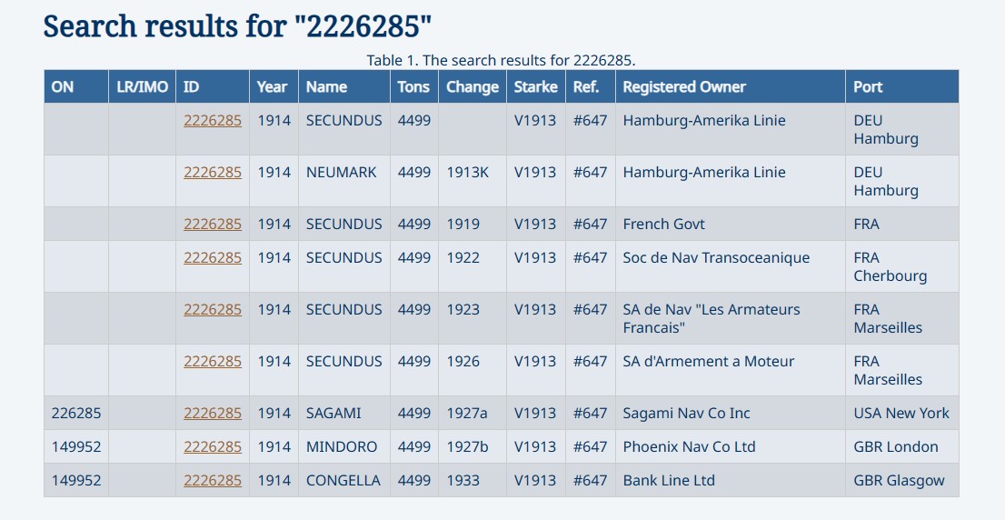 Voici la fiche Miramar du navire SECUNDUS, futur navire de la Société de Navigation Transocéanique :