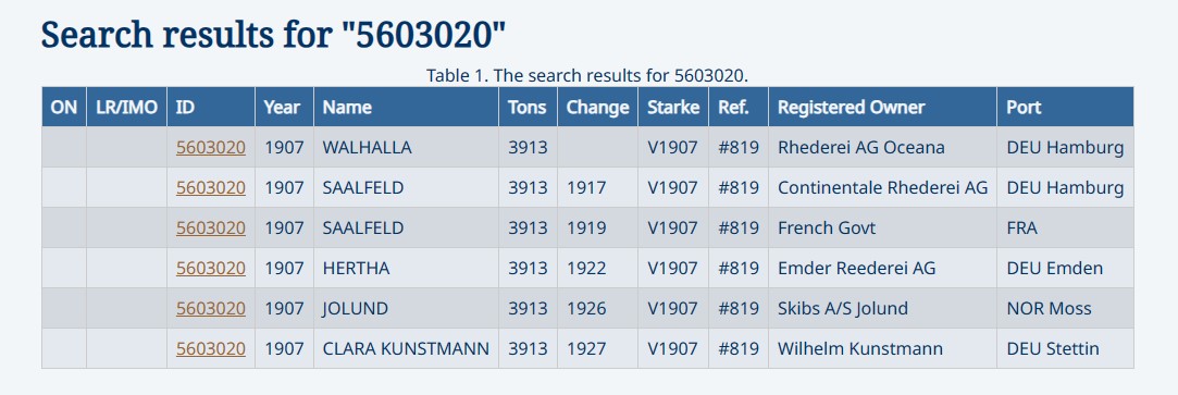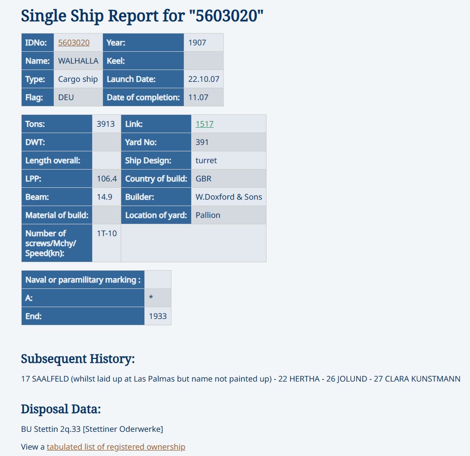 Voici la fiche Miramar du navire WALHALLA, saisi sous le nom de SAALFIELD, futur HERTHA de la compagnie allemande Emder Reederei AG :