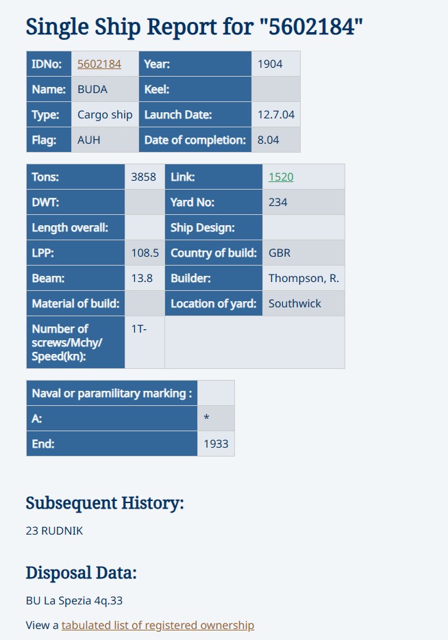 Le navire deviendra le RUDNIK et naviguera sous pavillon yougoslave jusqu'à sa démolition en 1933.