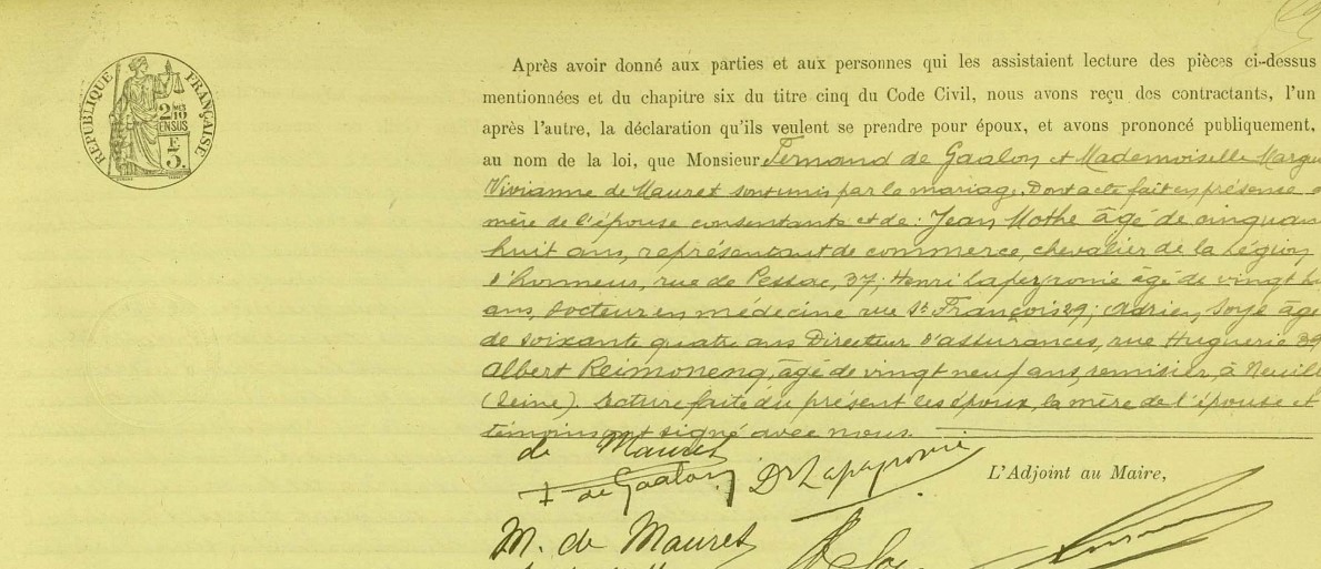 Le mariage a été célébré le 26 juillet 1911 à Bordeaux 2e section entre Fernand de Gaalon, commerçant ayant satisfait à la loi sur le recrutement, et Marguerite Vivianne de Mauret. Vous pourrez ainsi vous reporter à l'original car vous n'êtes pas obligé de croire sur parole ce qui suit.