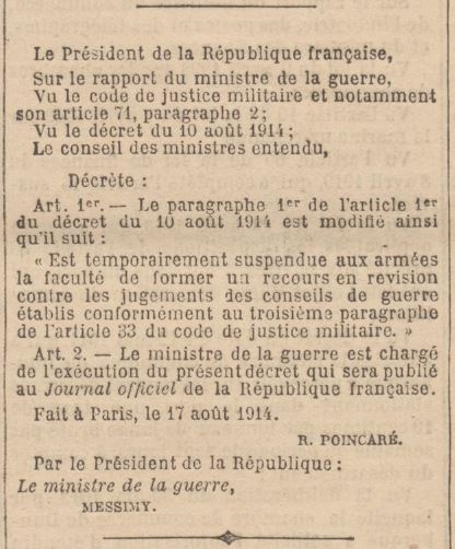 Prisme vient publier un article sur le soldat Pennerat dont le jugement a été compromis par un vice de procédure relativement répandu parmi les conseils de guerre temporaires spéciaux. Les conseils de révision ayant été suspendus par un décret ministériel du 17 août 1914 signé du Président Poincaré, les conseils de guerre temporaires spéciaux n’avaient plus de « boucle de rattrapage ». Les condamnés à mort étaient donc à la merci des connaissances de militaires appelés à devenir du jour au lendemain des administrateurs du fonctionnement de la justice militaire ou des juges.