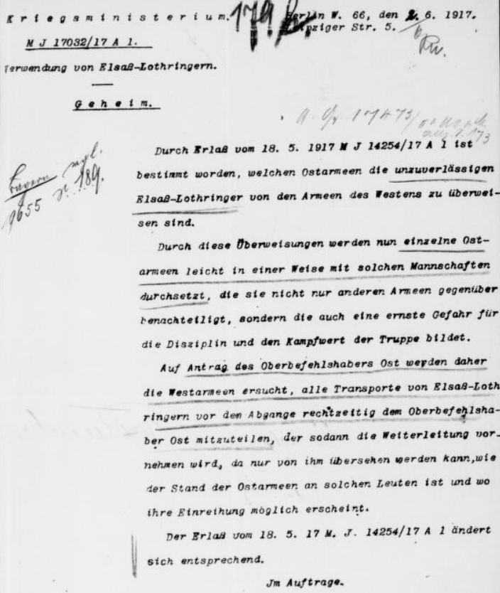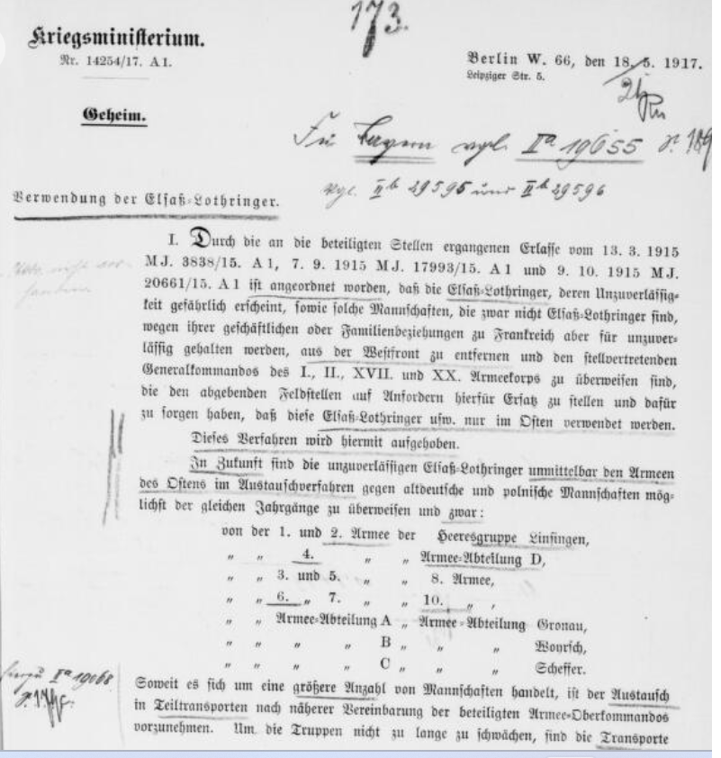 La lettre du ministère prussien de la Guerre du 18 mai 1917 fait référence à diverses instructions antérieures (de 1915) selon lesquelles les soldats alsaciens-lorrains « peu fiables » (!!!) ou les citoyens du Reich avec des relations familiales ou économiques proches avec la France qui étaient également considérés comme peu fiables ( !!!) devaient être envoyés à l'est (zones militaires : I ( = Prusse orientale/Est [Königsberg]) ; II (= Mecklembourg/Ouest) ; XVII (Mecklembourg/Est) ; XX (= Prusse orientale/Ouest)). En fonction du nombre de soldats alsaciens-lorrains, les zones militaires de l'Est doivent fournir le même nombre de soldats, de préférence du même âge, aux armées de l'Ouest.