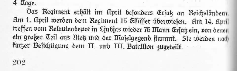 En avril [1916], le régiment reçoit des troupes de remplacement du « Reichsland » (=Alsace-Lorraine). Le 1er avril, 15 Alsaciens sont transférés au régiment. Le 14 avril, 75 hommes sont de nouveau arrivés du « Rekruten-Depot » de Ljubas. Une grande partie provient de Metz et de la Moselle. Après une courte inspection, ils étaient affectés aux 2e et 3e bataillons.