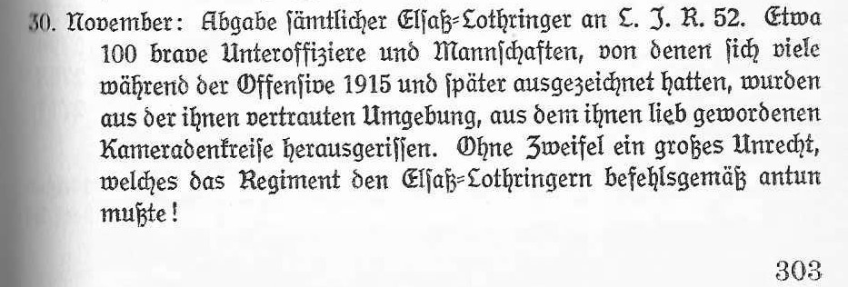 Mutation de tous les « Elsass-Lothringer » au L.I.R. 52. Une centaine de bons sous-officiers et soldats, dont beaucoup s'étaient illustrés lors de l'offensive de 1915 et après, furent arrachés au milieu qu'ils connaissaient et au cercle de camarades qu'ils affectionnaient. Sans doute une grande injustice que le régiment a dû commettre aux « Elsass-Lothringer » selon les ordres.