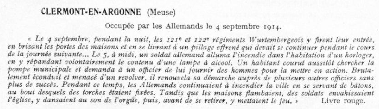 "Gerbéviller est pillée et incendiée (24 -27 août). Suivent de nombreuses exactions – viols, meurtres de civils – : 445 bâtiments incendiés ou détruits, 60 morts civils sont dénombrés. Après la reconnaissance des corps exhumés en septembre 1914, un rapport d'enquête est établi. Des photographies sont prises."