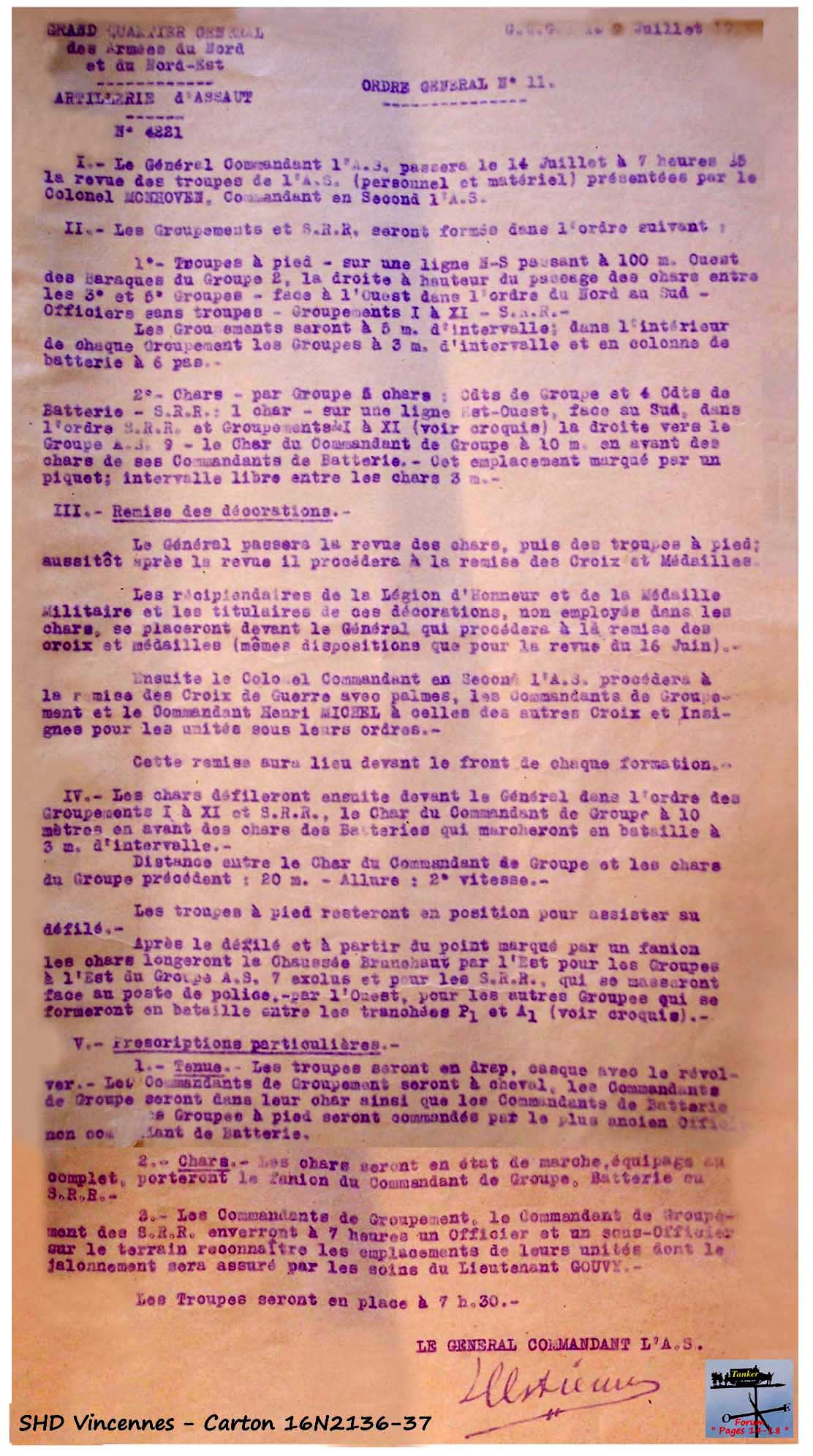 L'Ordre Général n°4881/GQG des Armées du Nord et du Nord/Est/Artillerie d'Assaut du 09 Juillet 1917 contient, en page 2, quatre croquis préparatoires à cette parade, croquis qui donnent une très bonne idée de ce que fut cette Prise d'Armes.