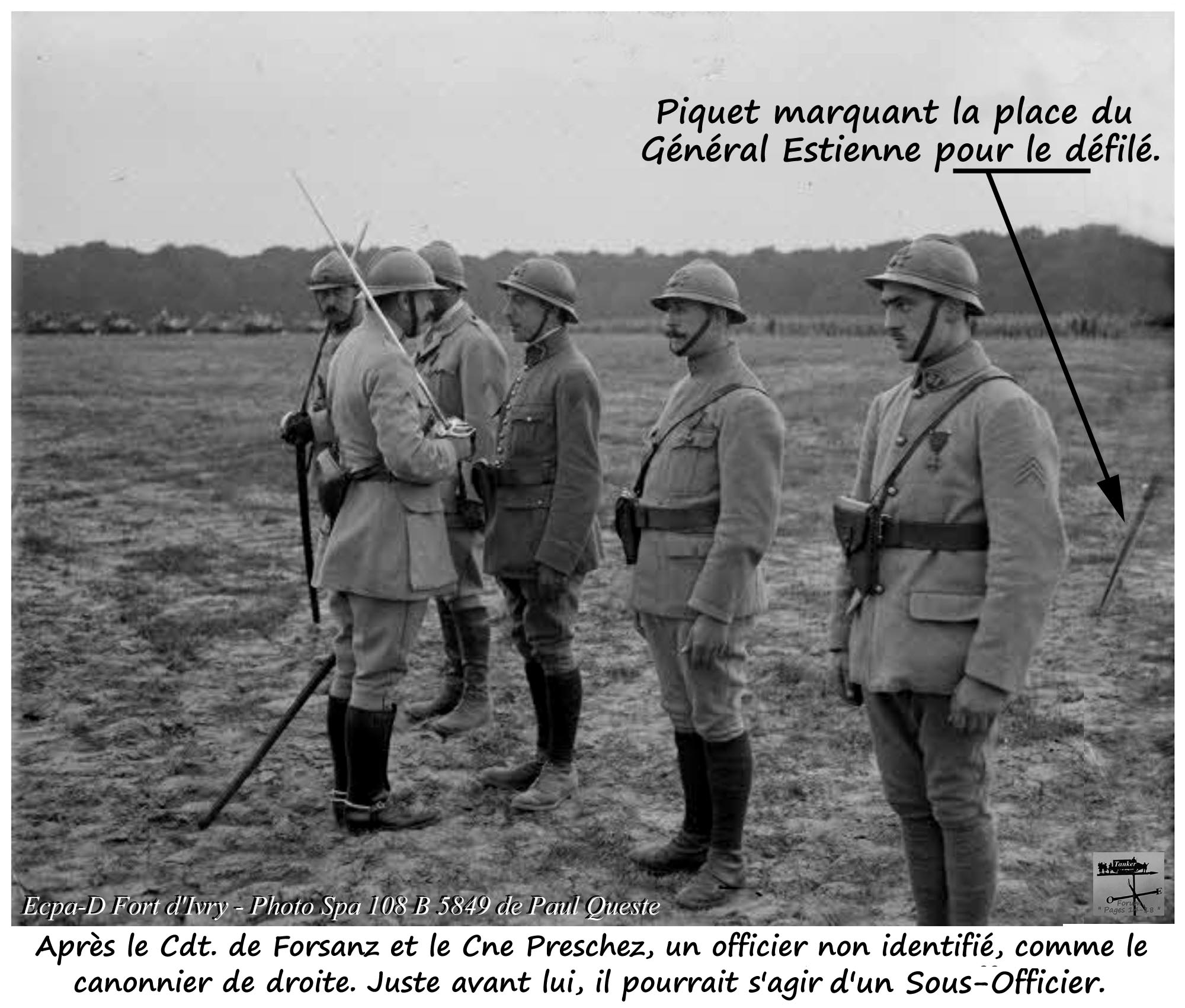 La prise d'armes du 14 juillet 1917 commence par une inspection à cheval faites par le Général Estienne et son adjoint le Colonel Monhoven, suivi d'un aide-de-camp et du porte fanion du Général, probablement aussi du Cne Communeau.