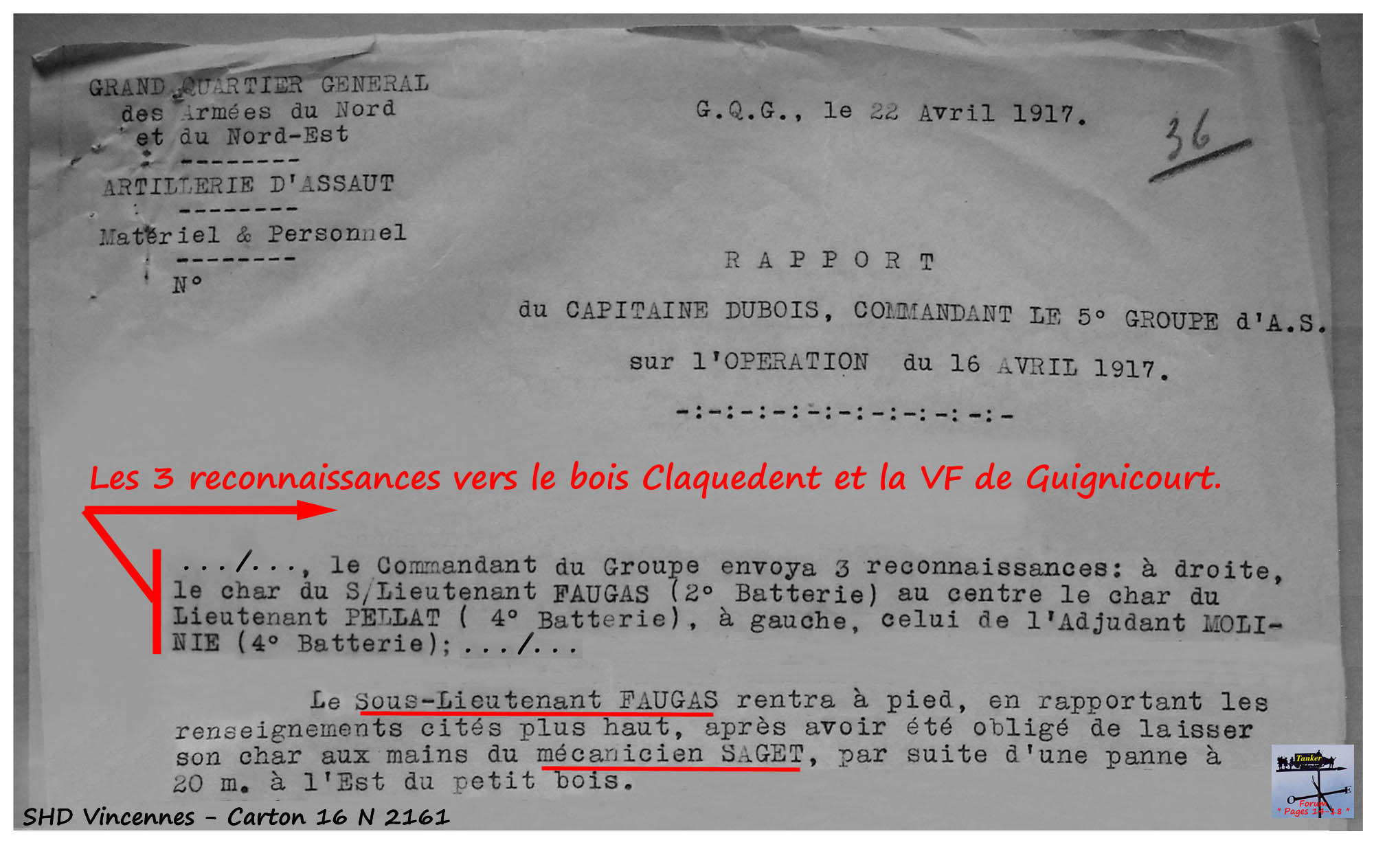 Le rapport du Cne Dubois est intéressant car il détaille bien l'envoie de 3 Schneider du Groupe, chargés de vérifier les abords de la VF de Guignicourt et du bois Claquedent et, concernant Louis Saget, il permet de découvrir que le Schneider du S-Lt Faugas, tombé en panne, a été laissé au main du Brigadier Saget.