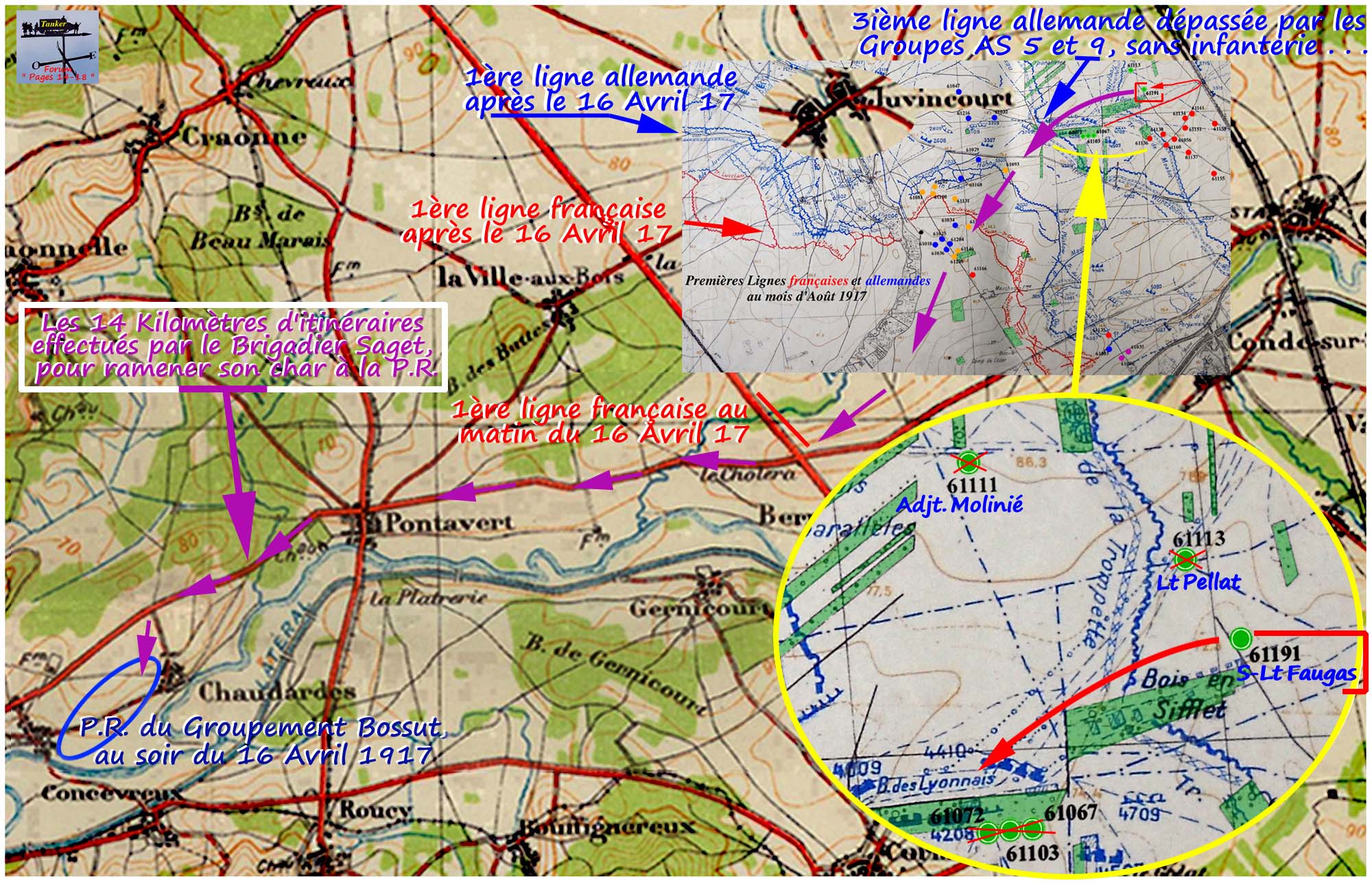 Sur un fonds de plan directeur édité avec la nouvelle première allemande, de l'été 1917, les chars schneider, en panne ou mis hors de combat dans l'engagement du 16 Avril 1917 sont parfois positionnés avec quelques différences sur les différentes car présentées ici.