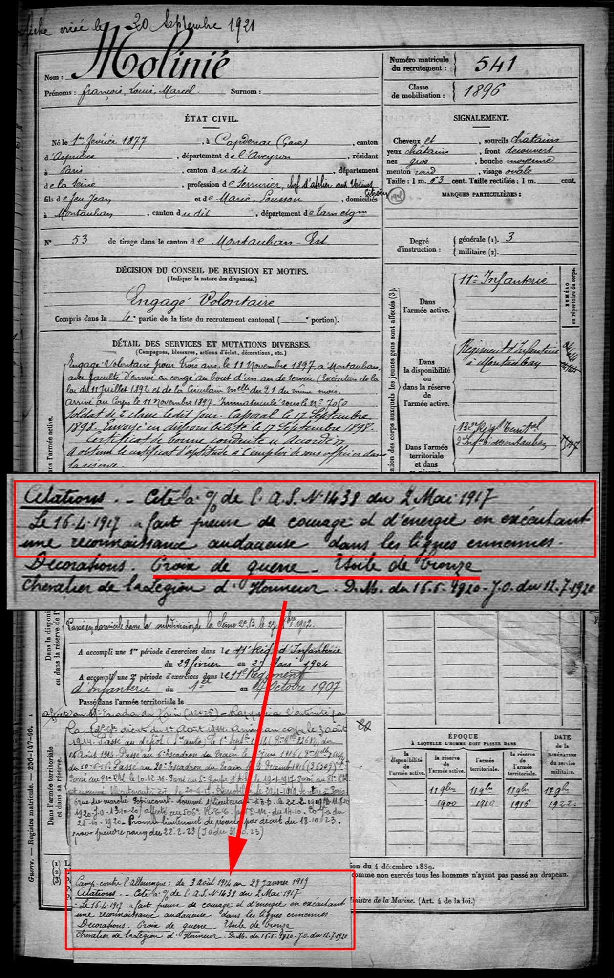 Sa fiche matricule est pour le moins sommaire et ne comporte pas même de case : Blessures, citations, décorations !
