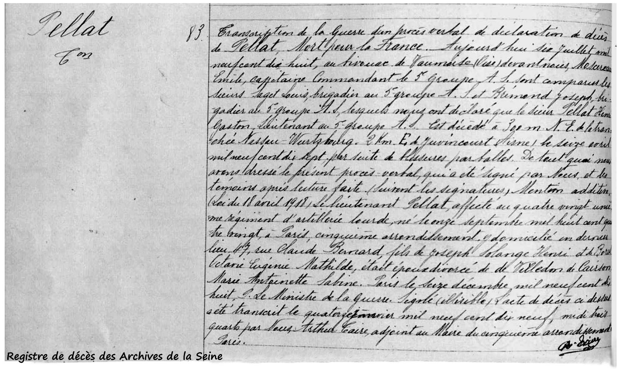L'acte de décès du Lt Pellat, retranscription de l'acte de décès officiel rédigé par le Groupe AS 5, date du de Juillet 1918 et a été rédigé par le Cne Noscereau.