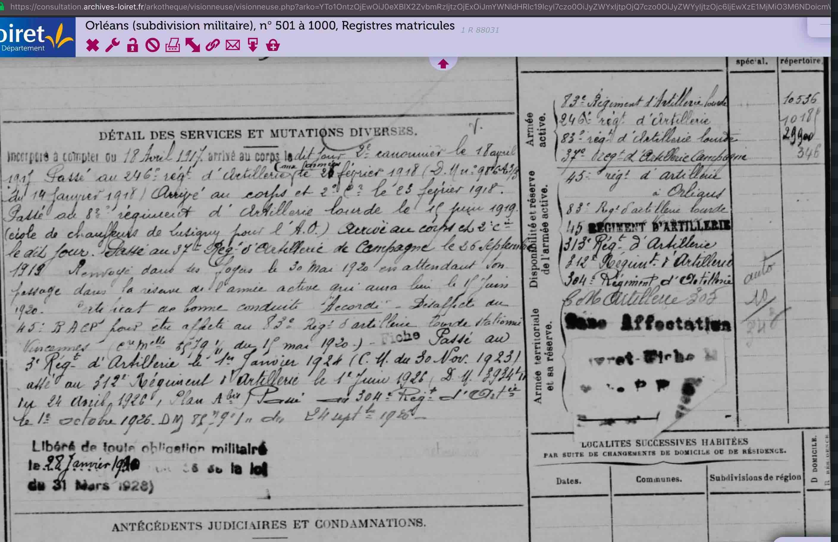 Mes seules données pour le moment proviennent de pages d’archives (AD45) signalant leur matricule, le détail de ses services et mutations et un relevé succinct sur sa participation à la campagne contre l’Allemagne. Pour Lous il est rappelé à la mobilisation générale et servira dns le train comme soldat de 2eme classe (40e RI, 260 RI., 20e escadron du train) Pour Jean il est tout d’abord incorporé en Avril 1917. Il est 2eme canonnier au 83e RAL pendant son service puis, il passe au 246e RA aux armées en février 1918. En février 1919, il revient au 83e RAL. Il fait l’école de chauffeur de Lusigny pour l’AO ; et enfin il passe au 37e RAC en septembre 1919.