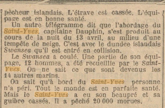 En 1912, le voilier SAINT YVES est impliqué dans un abordage avec le dundee irlandais SWANSEA (Gallica) :
