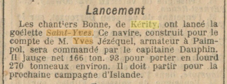 Voici un article sur le lancement du navire SAINT YVES publié par le journal "La Croix des Marins" du 31 janvier 1909 (Gallica) :