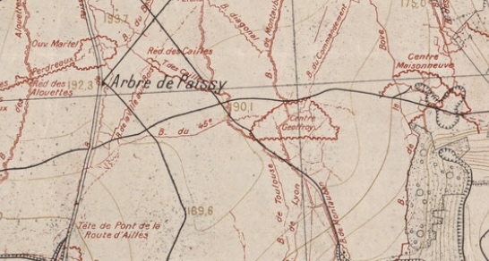 Ici je ne retrouve que l'Ouvrage Martel (à gauche en haut sur l'extrait de la carte du 25 mars 1917). Sur le premier extrait, à partir du Centre Geoffroy, suivre la Tr. de Cailles jusqu'au bord de la carte.